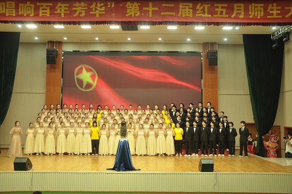 一曲红歌忆峥嵘岁月,一曲红歌唱百年辉煌。为庆祝共青团成立100周年,引导广大青年坚定理想信念、厚植爱国情怀、营造喜迎党的二十大浓厚氛围, 5月25日下午,学校“致敬红色团史,唱响百年芳华”第十二届“红五月”师生大合唱比赛在第一报告厅隆重举行,因疫情防控需要,本次比赛采用线下比赛,线上观看的形式。校领导王其军、杜宝山、张乐弟、高创宽、吴有恩出席线下比赛并颁奖,学校师生通过视频形式观看了比赛。