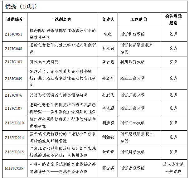 根据杭州市哲学社会科学规划领导小组办公室文件《关于公布2018年11月杭州市社科规划课题结题成果评审等级的通知》(杭社规〔2019〕6号),我校两项课题顺利通过专家评审予以结题,其中孙亚敏博士主持的《老龄化背景下儿童文学中老人形象研究》(课题编号为Z17JC048)确认为重点课题,评审等级为优秀;许琼老师主持的《网络公益的社会影响与政府规制研究》(课题编号为M18JC018)确认为一般课题,评审等级为良好。据悉,此次结题申请共103项,其中,92项符合结题申请条件进入专家评审,经评审,“优秀”等级10项、“良好”等级66项、“合格”等级16项。