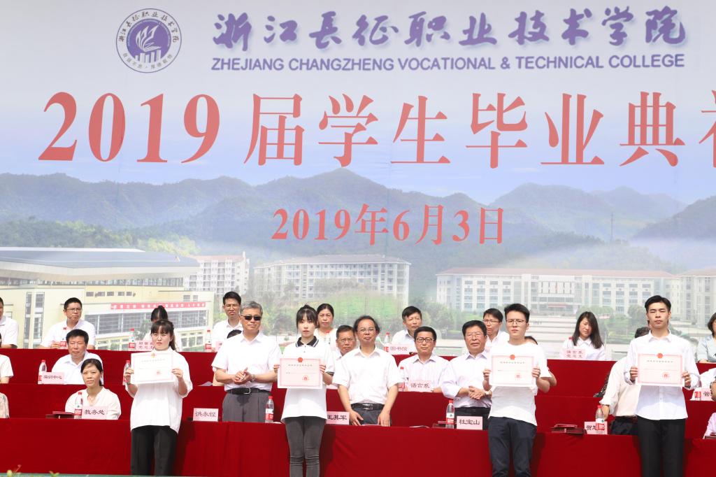 毕业典礼在庄严的国歌声中拉开帷幕。副院长杜宝山宣读了国家奖学金获得者、省级、院级优秀毕业生表彰的《决定》,许群伊等4名学生荣获2017-2018学年国家奖学金,郑诗雨等111名学生被授予“浙江省普通高等学校优秀毕业生”称号,陈琦琦等301名学生被授予“浙江长征职业技术学院校优秀毕业生”称号。杜院长希望受表彰的毕业生珍惜荣誉,再接再厉,积极投身创新创业大潮,在新的岗位上建功立业,为母校增光添彩,努力在实现中国梦的伟大实践中创造自己的精彩人生,也希望全校同学以先进典型为榜样,弘扬“自强不息,厚德载物”的校训精神,刻苦学习,奋发进取,努力取得优异成绩。随后,出席典礼的学校领导向受表彰同学颁发了荣誉证书。