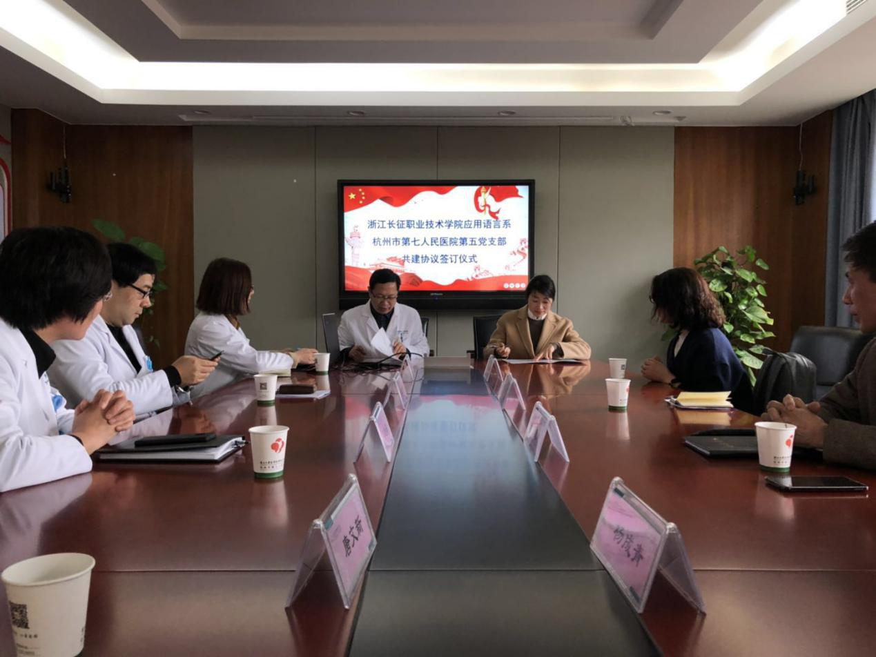 会上,先由郑雪春代表语言系党总支与杭州市第七人民医院第五党支部书记唐文新签署党建合作共建协议。根据协议,双方决定实施“党建引领社会服务”工程,本着“资源共享、优势互补、服务联动”原则,共同打造新型基层党组织建设、党员教育服务、青年成长成才平台,构建党建工作新模式。