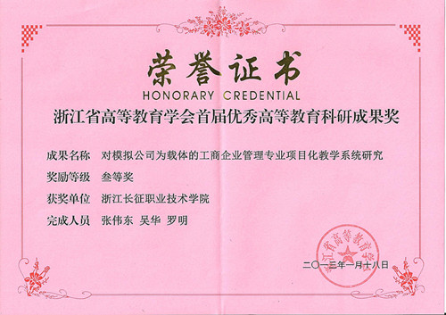 我院张伟东等教师申报的“对模拟公司为载体的工商企业管理专业项目化教学系统研究”荣获浙江省高等教育学会首届优秀高等教育科研成果三等奖。