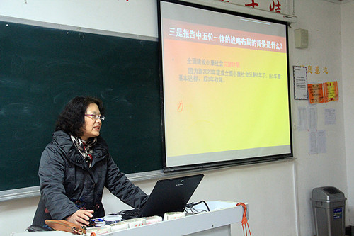 首先,管理系党总支副书记孙金动代表管理系师生对王莉教授的到来表示热烈的欢迎,在大家热烈的掌声中,讲座正式开始。在讲座中,王莉教授通过报告的主题、报告最大的理论创新和历史贡献、全面建成小康社会的战略部署、报告中五位一体的战略布局的背景、报告的落脚点、报告最重要的关键词六个方面对十八大报告进行了解读;随后,王莉教授又从过去五年工作和十年的基本总结、夺取中国特色社会主义新胜利、全面建成小康社会和全面深化改革开放的目标三个方面为大家做了详细的阐述。在介绍到党的指导思想时,她指出近几十年来,党的指导思想一直在不断创新,不断丰富,与时俱进,而十八大召开后,我国将继续坚持这一道路,如此中国社会主义制度才能具有强大的生命力,才能立足于世界。最后,王莉教授指出十八大是一次真正民族复兴的会议,它旨在把中国全面建设成为小康社会。