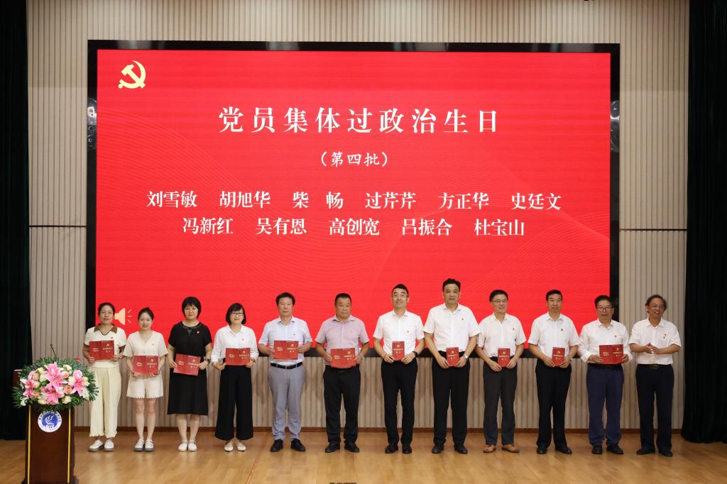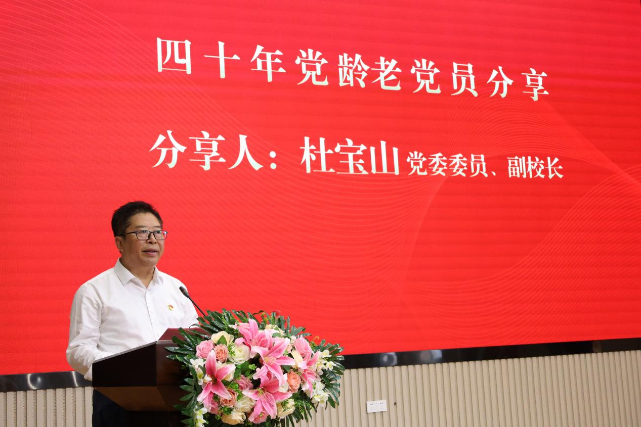 今年表彰大会增加政治生日环节,为全校党龄20年以上的党员同志集体过政治生日,并送上精心准备的政治生日贺卡,以此表达对老党员的崇高敬意和深切关怀。杜宝山作为老党员代表进行了分享,他以自己入党40年以及在学校工作15年的经历为线索,深情回顾了党的光辉历程和自己的成长轨迹,强调了党员身份的责任与担当,为在场党员上了一堂生动的党课。随后全体老党员重温了入党誓词。