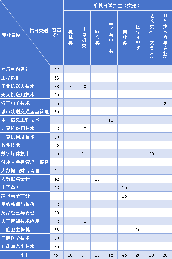 第八条 招生专业、科类及计划。招生专业22个,招生计划1000名。其中面向普高招生考生计划760名,面向单独考试招生考生计划240名,学制均为三年,具体专业计划如下表: