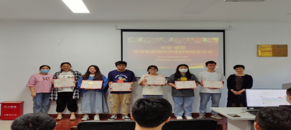 近日,商务与贸易学院和杭州豪歌电子商务有限公司(以下简称杭州豪歌)联合举办的首届长征·豪歌跨境电商现代学徒班结业仪式在实训楼室南110室顺利举行。商务与贸易学院院长王珍、副院长陈露,杭州豪歌总经理王建豪、副总经理许新、运营总监金开,全体跨境电商教研室教师及学徒班学生参加了结业仪式。