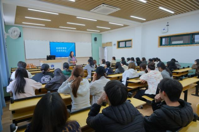 宣讲环节,翟晓露、谢蕾、金晓丽分别介绍了银行岗位薪资体系、福利保障与职业晋升通道、职场环境以及招聘岗位。王丹琦老师详细讲解了银行从业资格证的考试科目、重难点划分、高效备考方法与学习规划技巧。